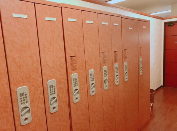 着替えは、こちらのロッカールームで行います。ここで、用意されている紙パンツと巻きタオルに着替えます。全てのロッカーに、暗証番号式のカギが付いているので貴重品を入れていても安心です。