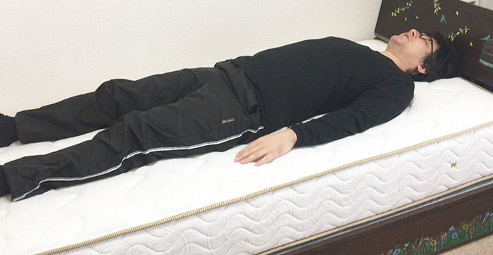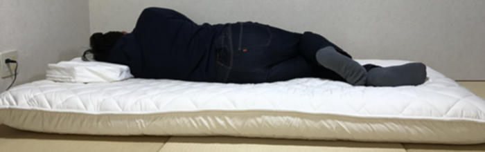 続いて、いよいよ実際の寝心地を確かめました。まず、感じたのが、一番でっぱっているお尻の部分だけうまく沈んでくれることです。したがって、寝姿が立ったままの姿勢と同じような感じです。