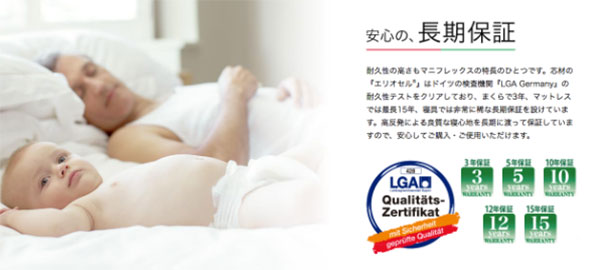 マニフレックスは、寝具としては異例の長期品質保証を行なっています。 各種3年〜15年の保証期間が設定されており、この保証期間は使用している芯材によって変わります。 汚れや破損は対象外で、芯材が体型に合わせて凹んだり、変形した場合に交換することができるサービスです。 マットレスの耐久性や凹みが心配な方も、これなら安心して使用できますね。