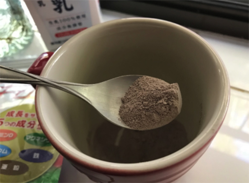 スプーンすり切り2杯を牛乳70mlで溶かしてください、とパッケージの裏に書いてありますが、すり切り2杯は面倒なので私はスプーン1杯を山盛り入れています。